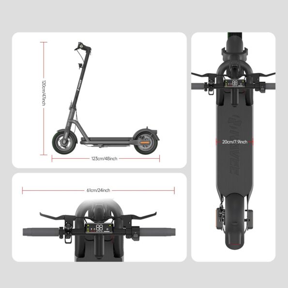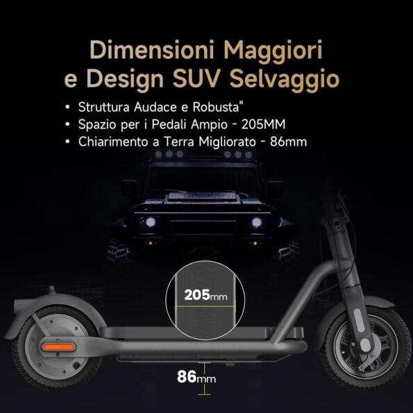 - Tamaño más grande y neumáticos todo terreno: Neumáticos tubeless todo terreno de 10,5″ con un ancho de 80 mm. 205 mm de espacio para los pedales y una altura del suelo mejorada de 86 mm, que ofrecen una estabilidad y un control superiores en todo tipo de terrenos.