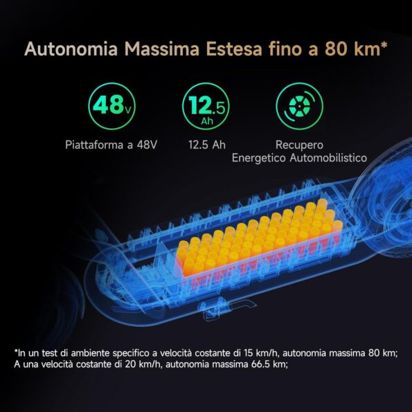 - Autonomía de 65 km: Alimentado por baterías de litio 18650 de alta seguridad y un sistema de recuperación de energía de calidad automotriz, te permite recorrer hasta 65 km con una sola carga — perfecto para tus trayectos diarios y aventuras al aire libre.